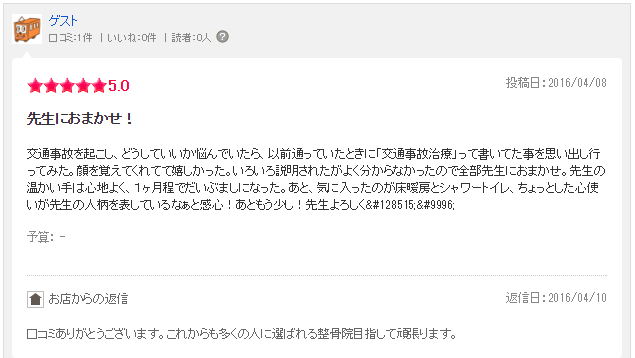 をして頂き安心して施術に専念できています。交通事故にあったら