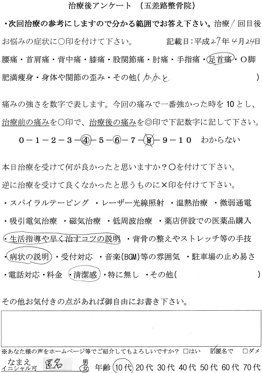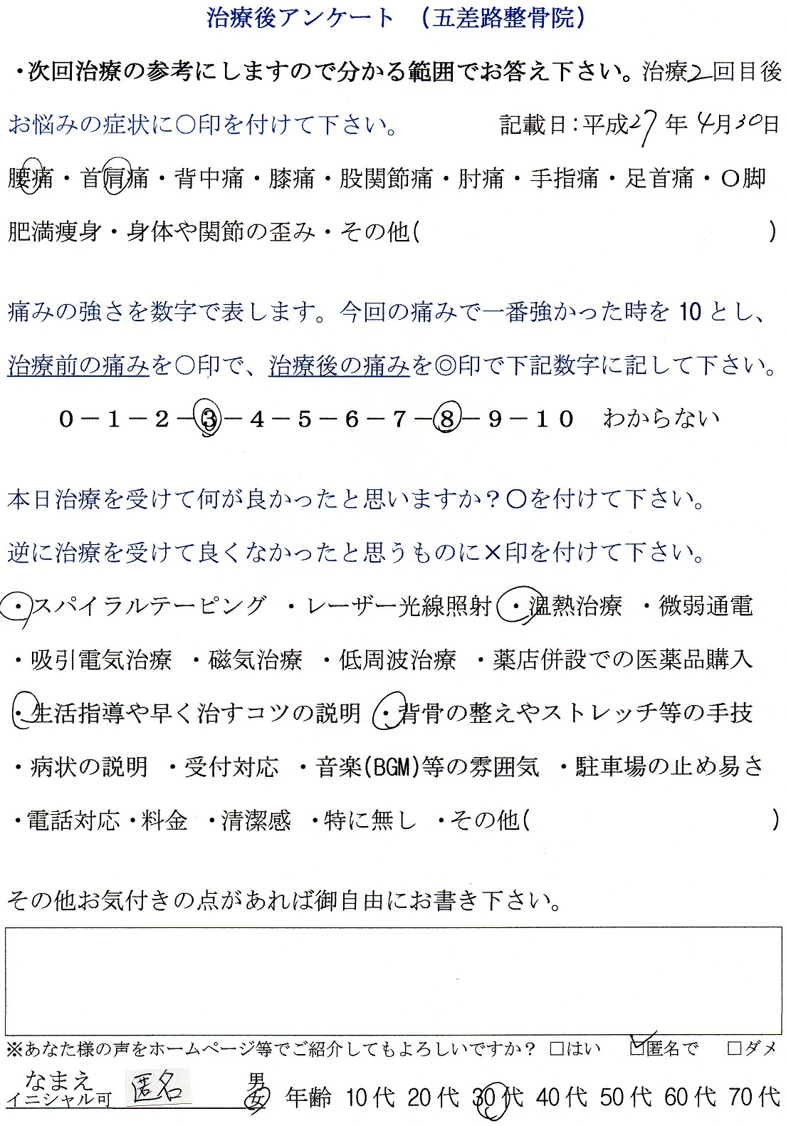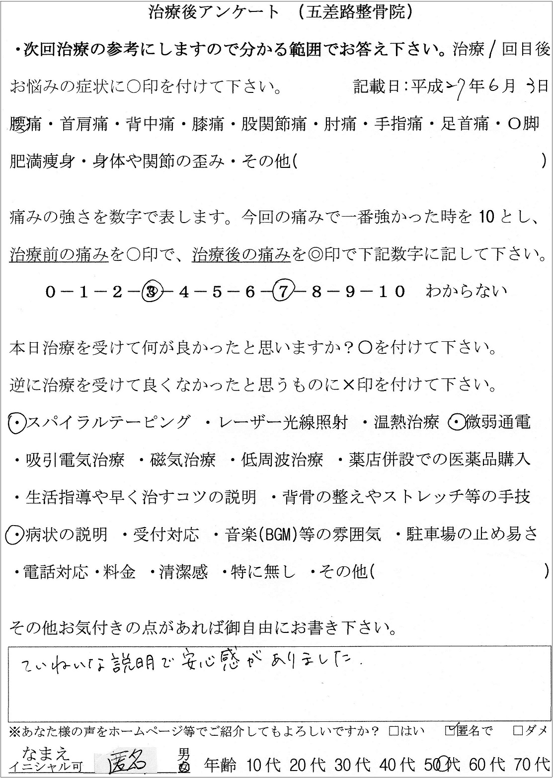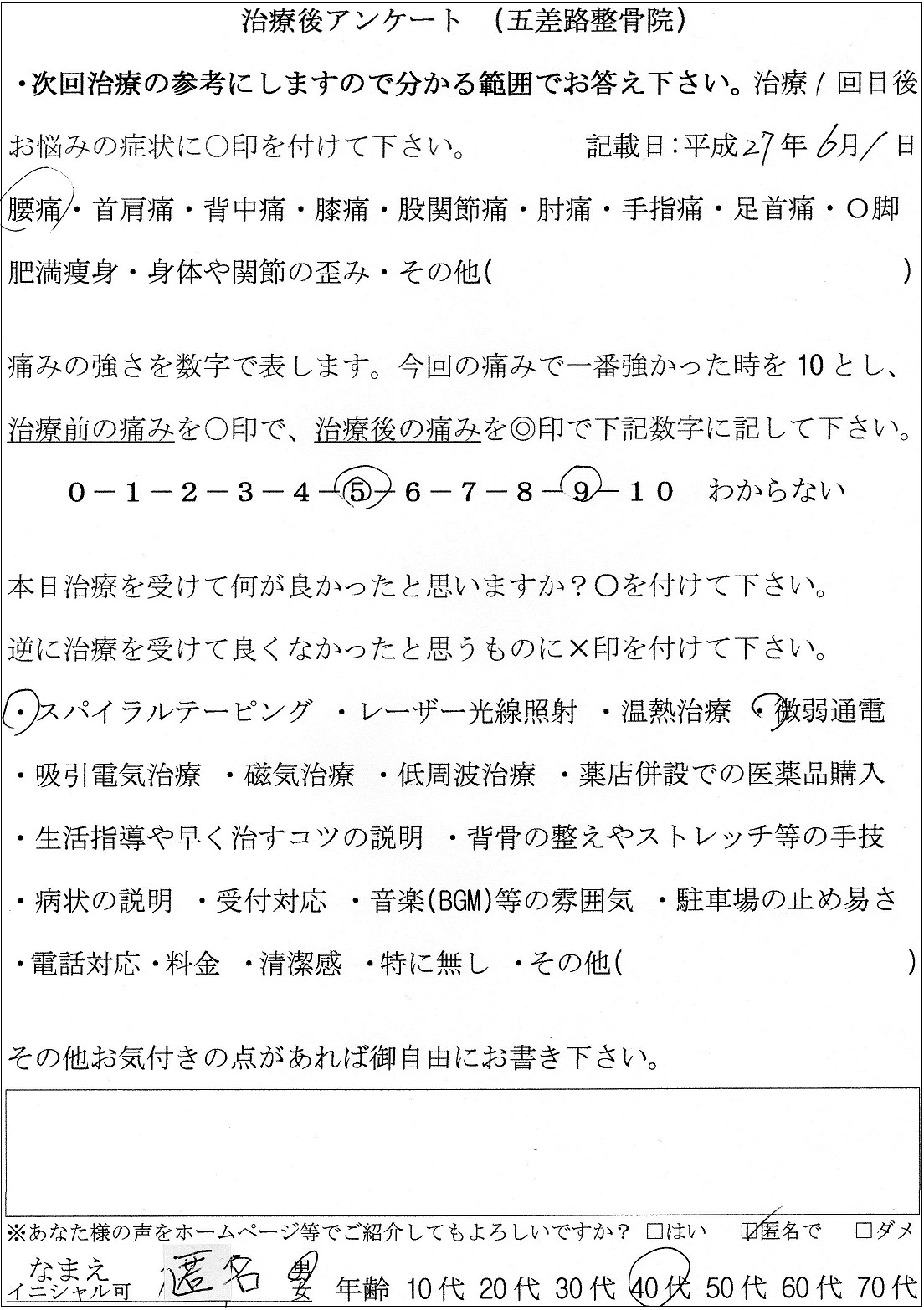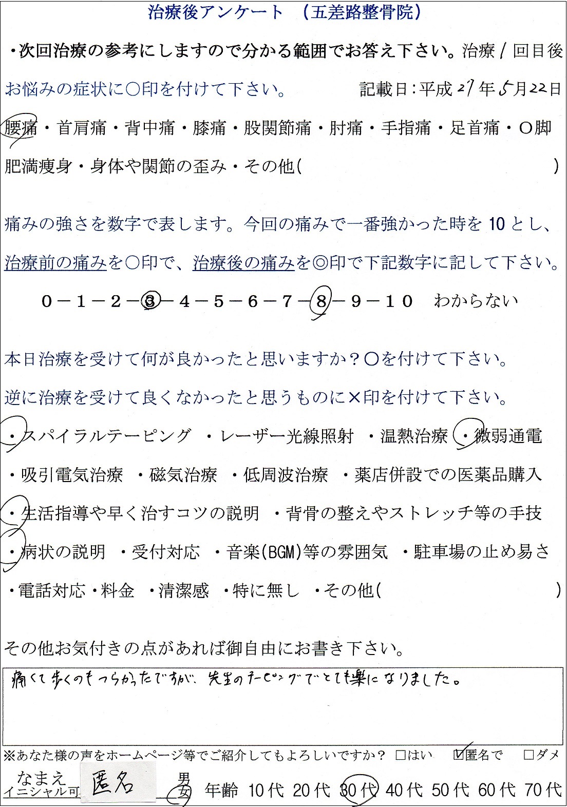 【良かった点】「スパイラルテーピング」「微弱通電」「生活指導や早く治すコツの説明」「病状の説明」に○を頂きました。 『痛くて歩くのもつらかったですが、先生のテープでとても楽になりました』