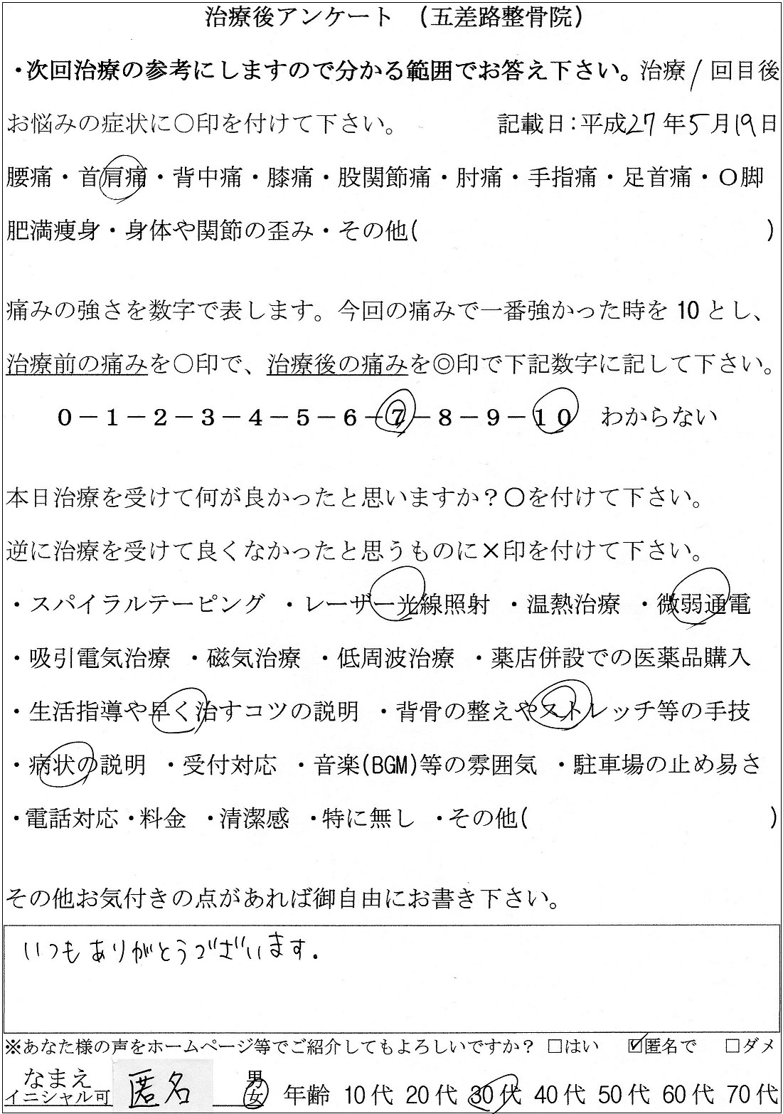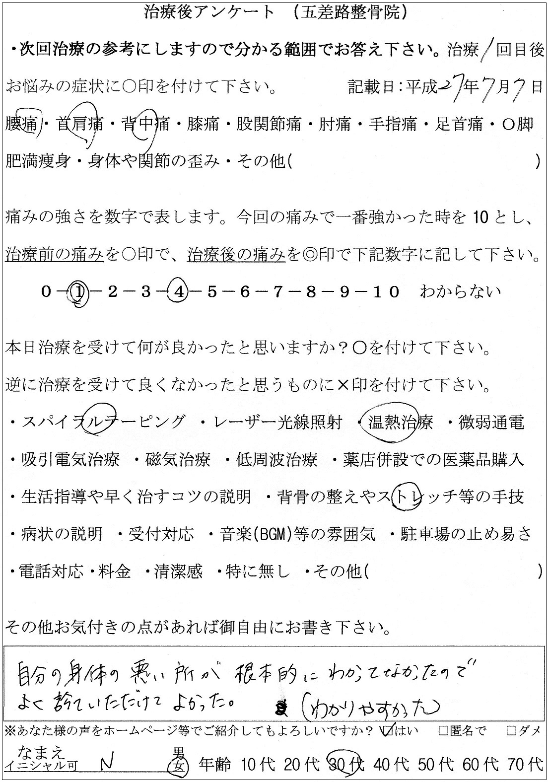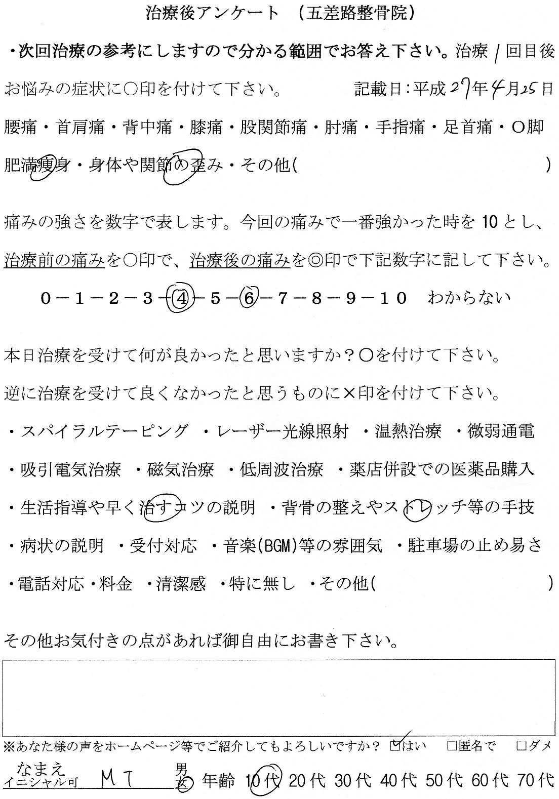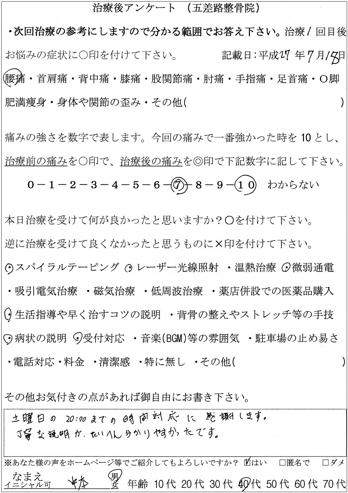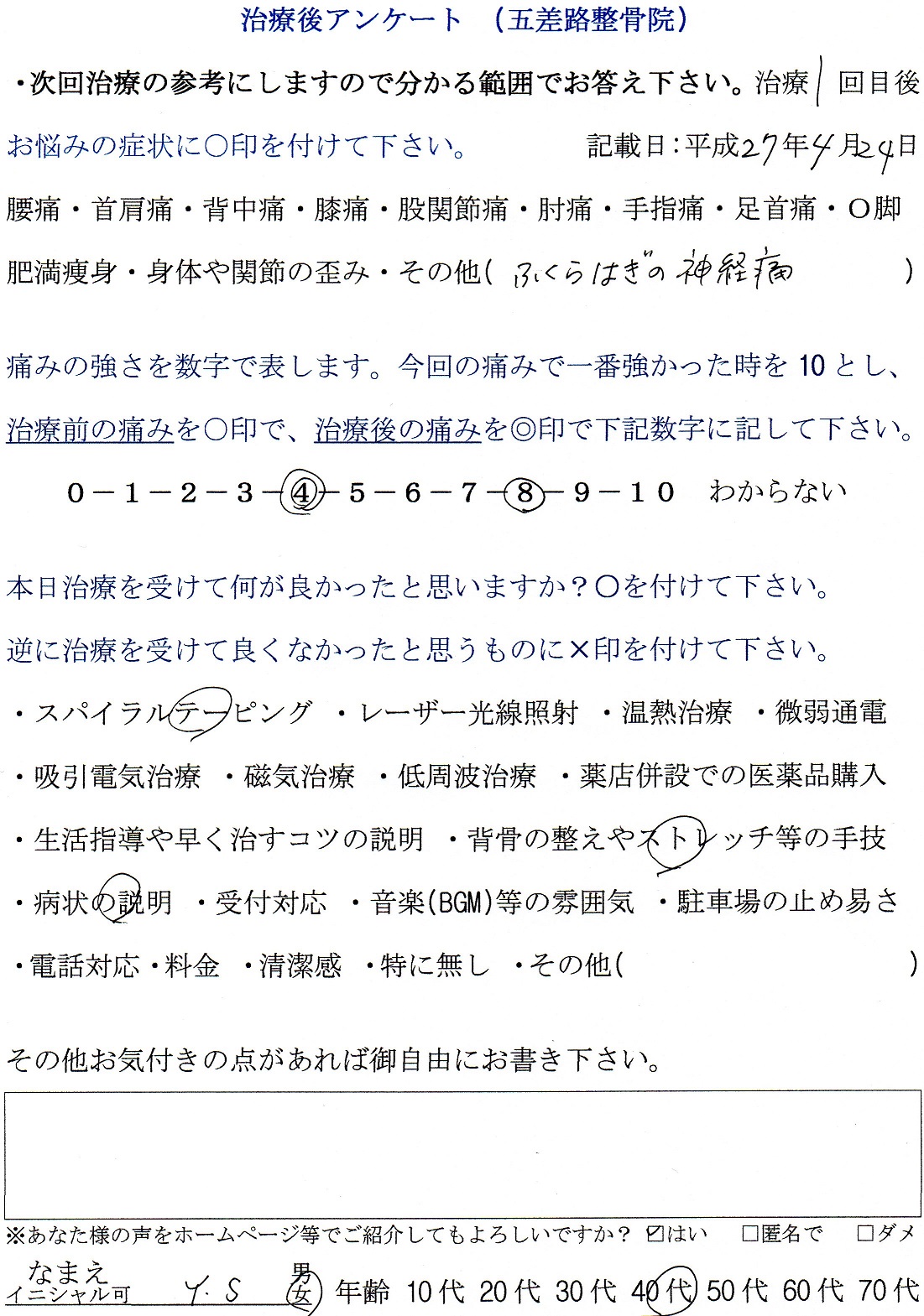 【良かった点】「スパイラルテーピング」「微弱通電」「生活指導や早く治すコツの説明」「病状の説明」に○を頂きました。 『痛くて歩くのもつらかったですが、先生のテープでとても楽になりました』