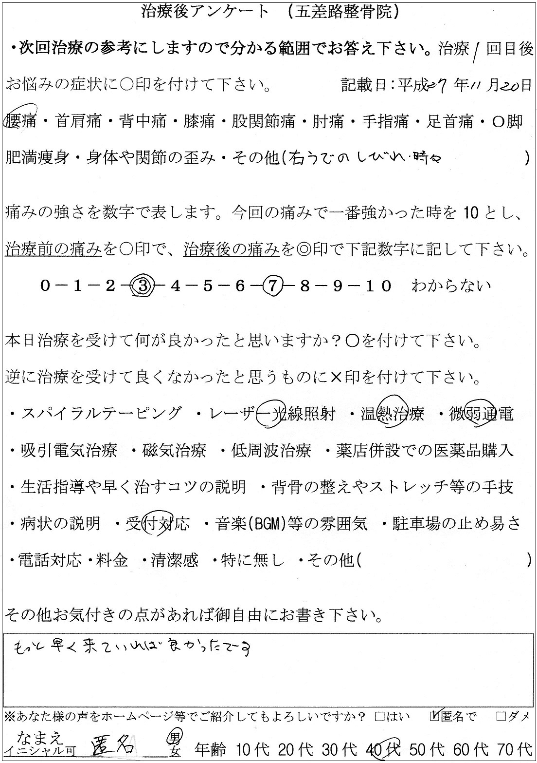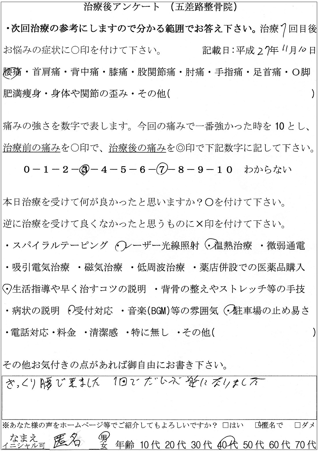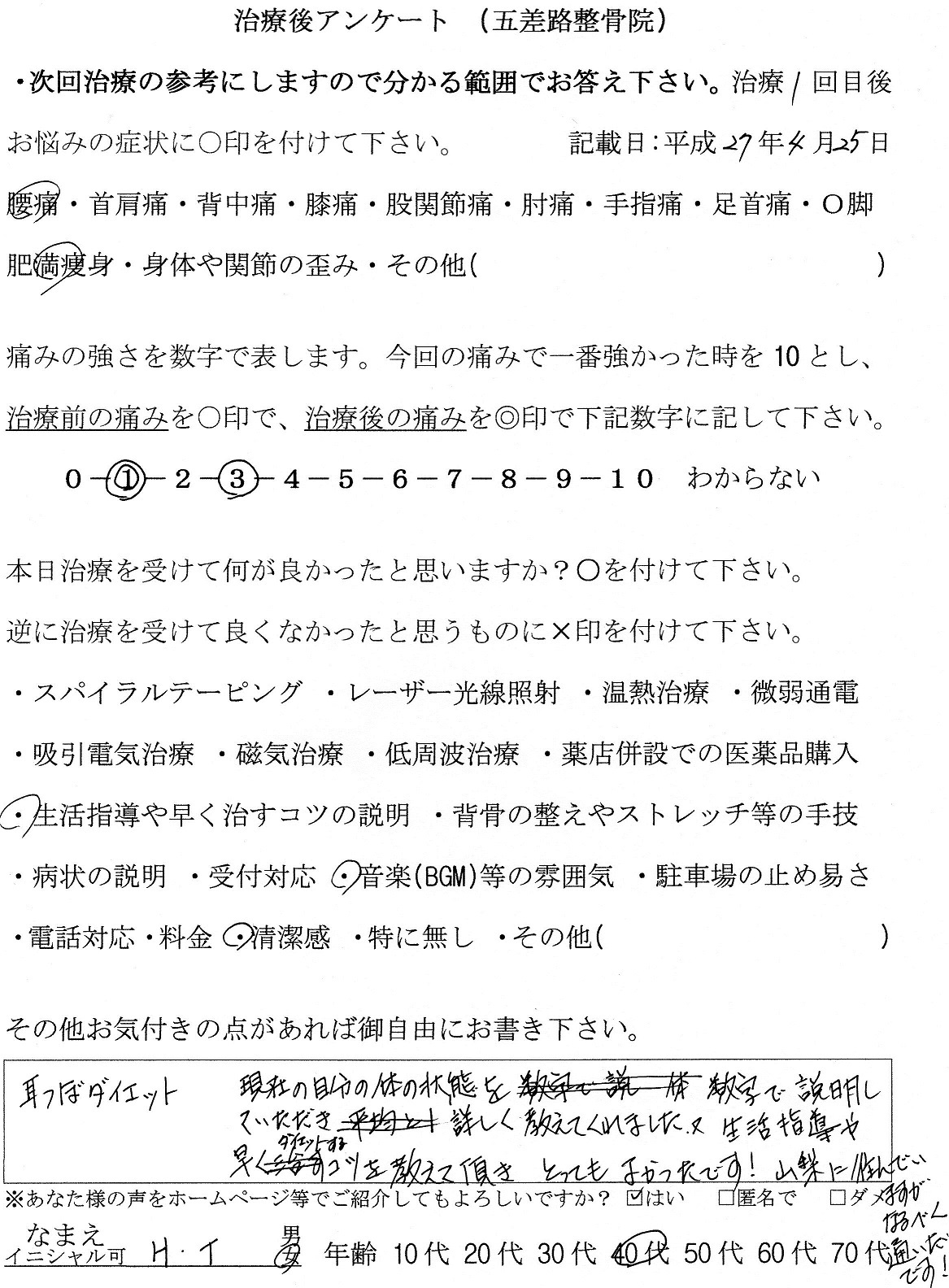 40代女性H.Tさんの治療後アンケート腰痛と耳ツボ痩身で来院。初回1回の治療で「3」ある痛みが「1」にまで軽減。