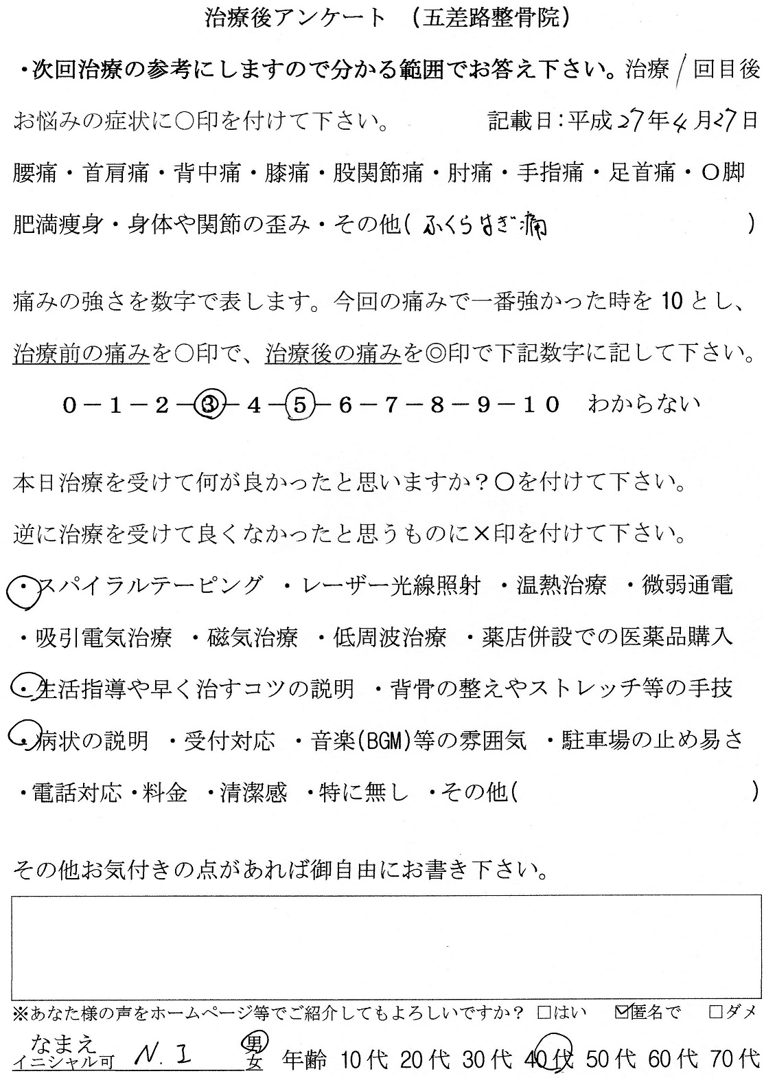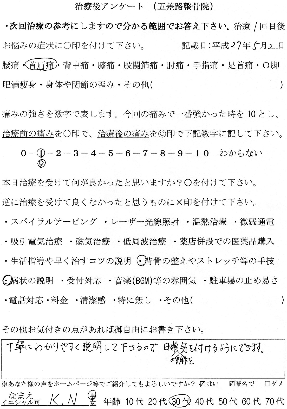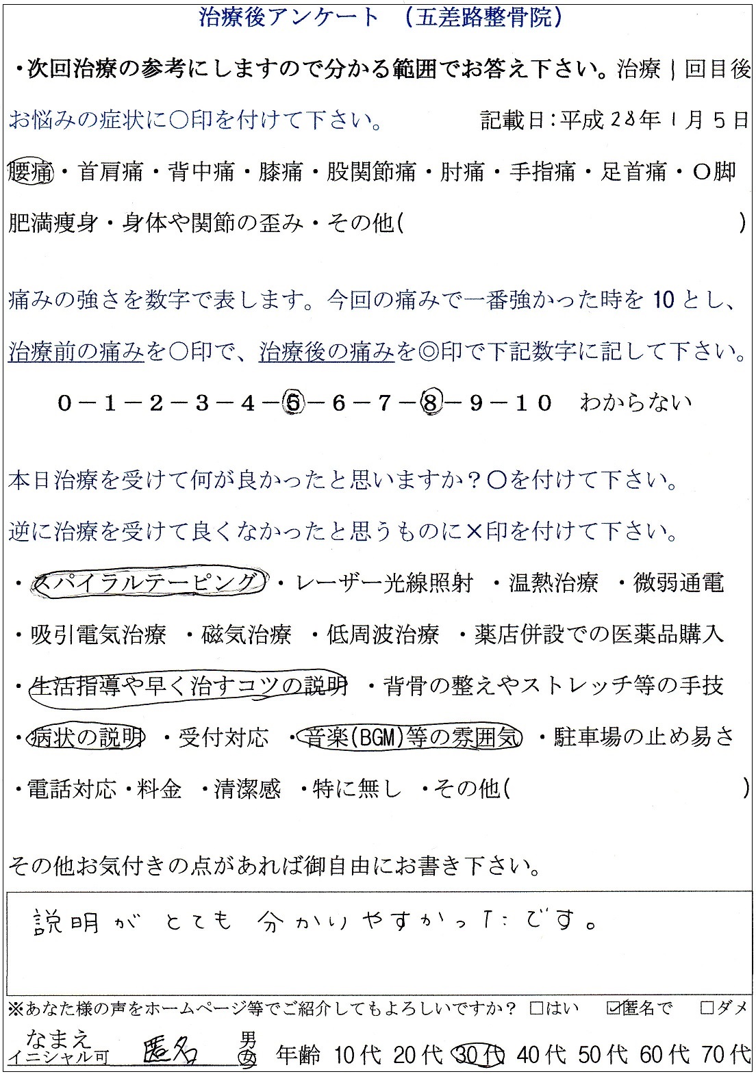 【良かった点】「スパイラルテーピング」「レーザー光線照射」「微弱通電」「生活指導や早く治すコツの説明」「背骨の整えやストレッチ等の手技」 「病状の説明」「受付対応」「音楽(BGM)等の雰囲気」「電話対応」に○を頂きました。 『ガイコツでの説明がわかりやすく良かったです』