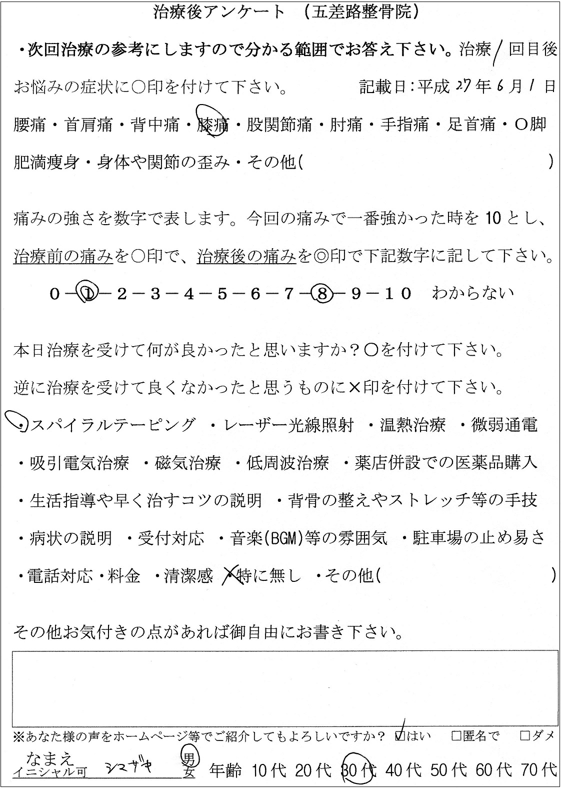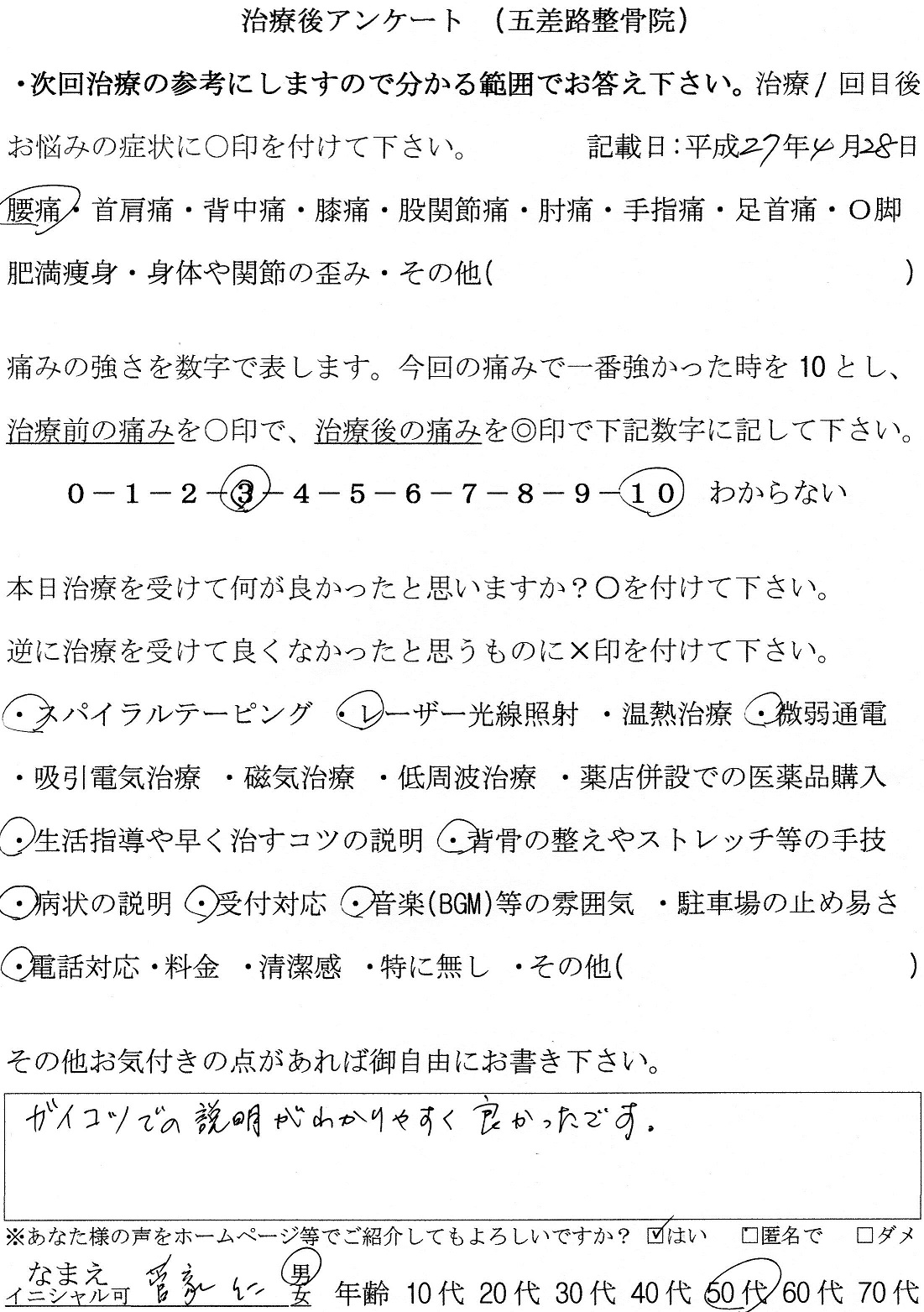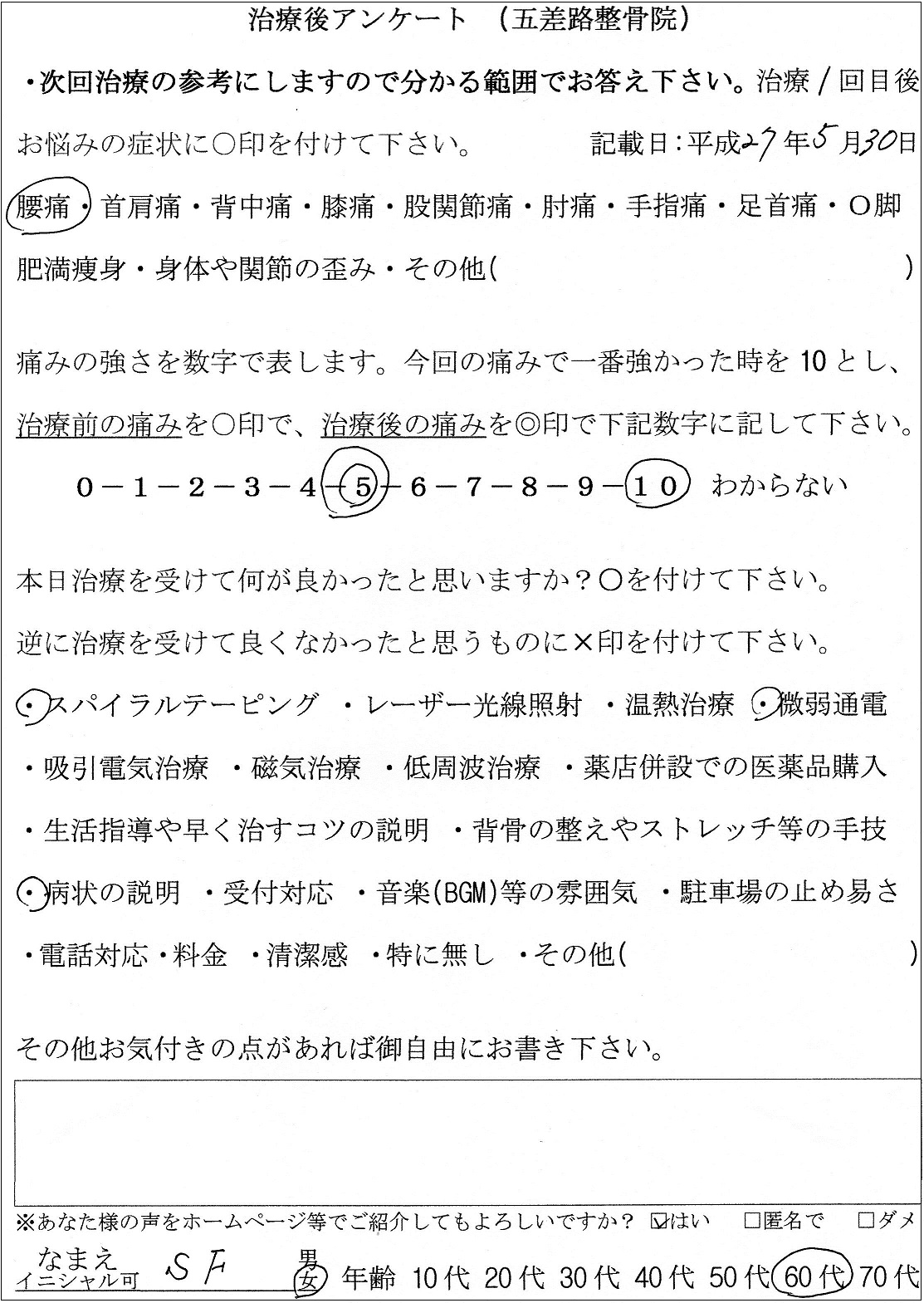 50代男性菅家さんの治療後アンケート腰痛で来院。初回1回の治療で「10」ある痛みが「3」にまで軽減。