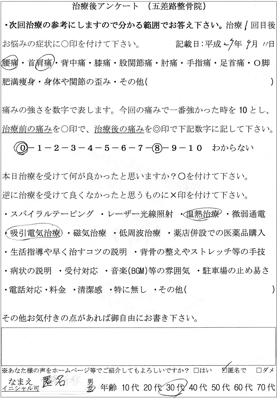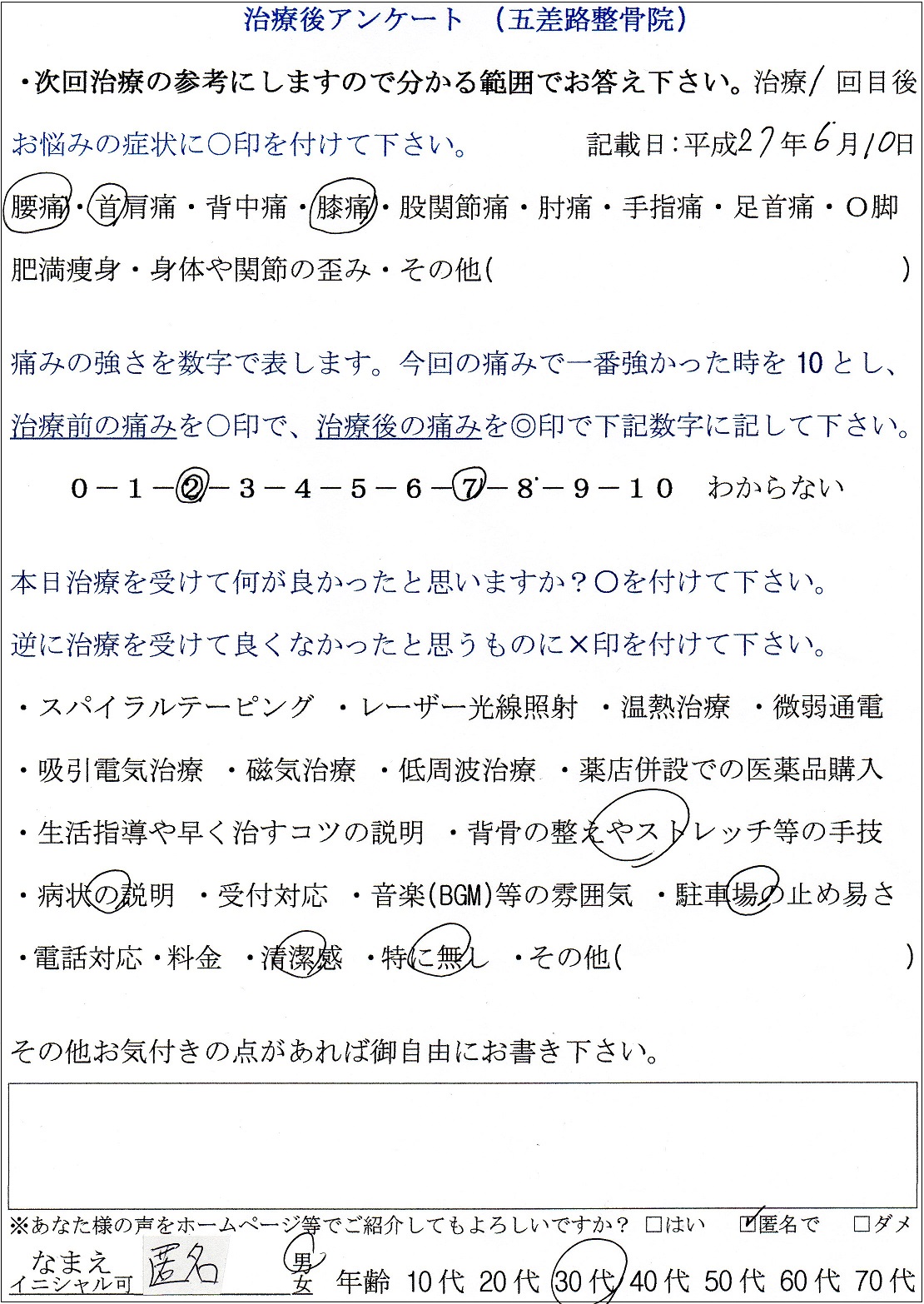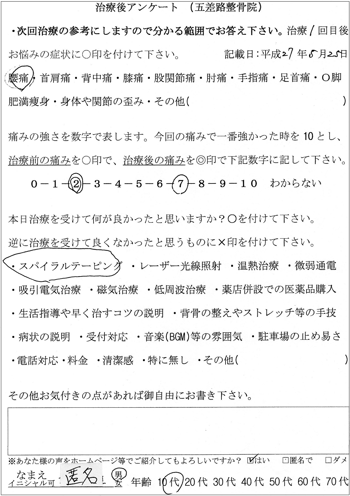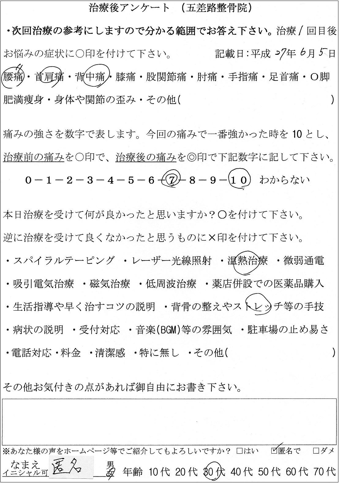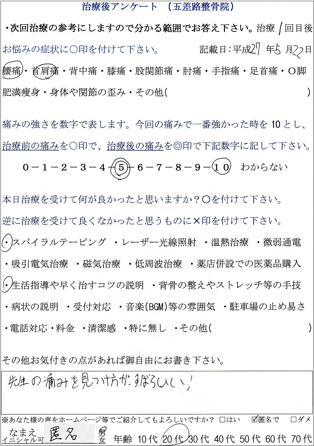 20代男性匿名さんの治療後アンケート腰首肩痛で来院。初回1回の施術で「10」ある痛みが「5」にまで軽減。