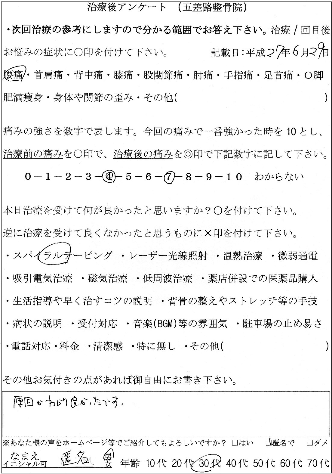 30代女性匿名さんの治療後アンケート腰痛で来院。初回1回の施術で「8」ある痛みが「3」にまで軽減。
