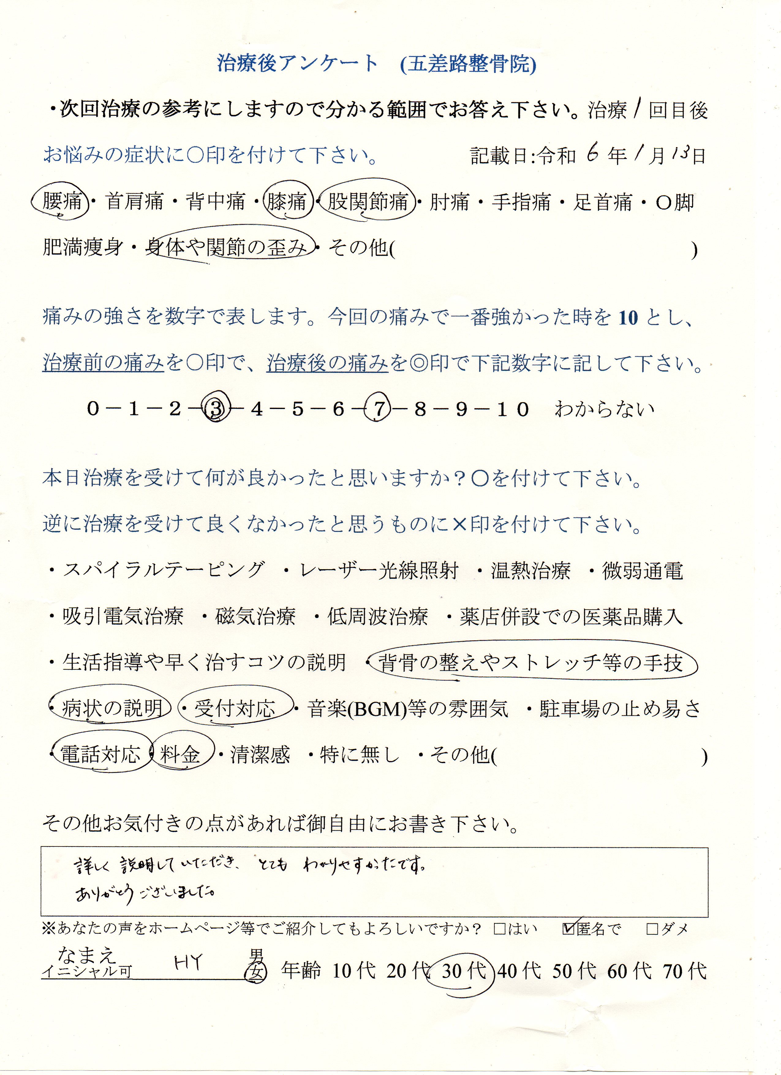 【良かった点】「背骨の整えやストレッチ等の手技」「受付対応」「電話対応」「病状の説明」「料金」の5つに○を頂きました。 『詳しく説明していただき、とても 分かりやすかったです。ありがとうございました。』と言って頂きました。