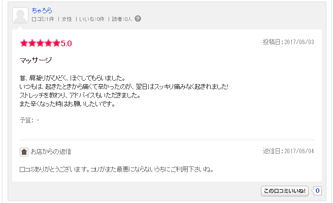 首、肩凝りがひどく、ほぐしてもらいました。いつもは、起きたときから痛くて辛かったのが、
